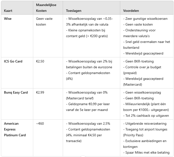 Goed om te weten is dat Mastercard en Visa creditcards wereldwijd het meeste worden geaccepteerd. Maar welke specifieke creditcards zijn dan het beste? Er zitten vaak allemaal kosten, haken en ogen aan vast. En dit kan het lastig maken om er een te kiezen. Zelf draag ik standaard twee Visa prepaid creditcards bij me. De Go-card van ICS, en de fysieke en digitale creditcard van Wise. Laten we deze kaarten even op een rijtje zetten.